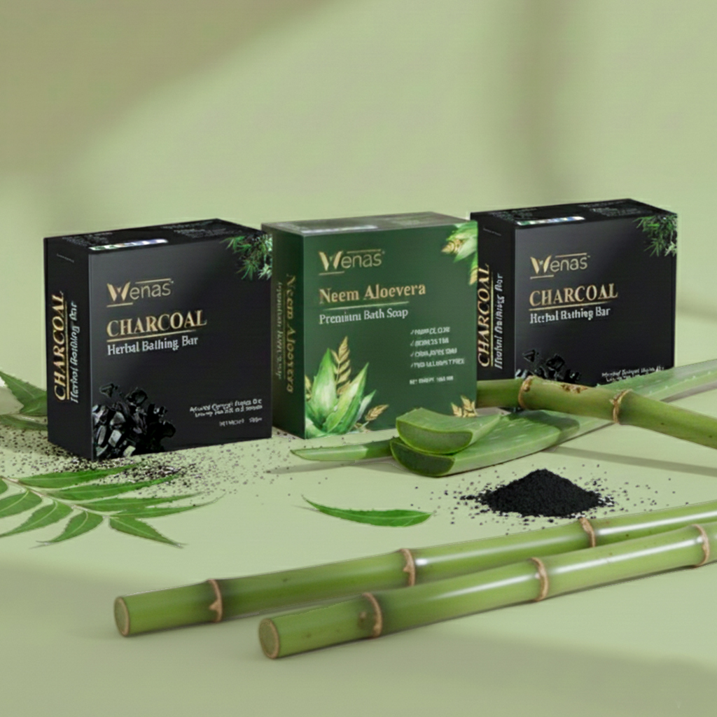 The perfect daily skincare trio! This combo includes 2 Wenas Charcoal Herbal Bathing Bars for deep detox cleansing and 1 Wenas Neem Aloevera Soap for soothing and healing care. Together, they cleanse, nourish, and protect your skin naturally—ideal for acne-prone, oily, and sensitive skin types.